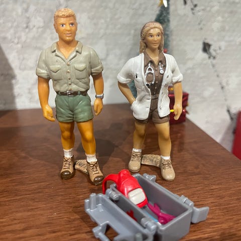 Eläinlääkäri/ Kpl ja laukku varusteineen. Tumma hiuksisessa kulumaa. Vaaleassa vain pientä jälkeä. Yhteensä 15€. Sis 2 lääkäriä ja 1 laukku.