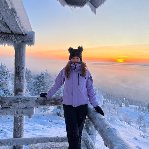 Useampi tasku, lumilukot vyötäröllä ja hihoissa.