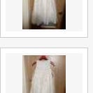 Valkoinen juhlamekko bolerolla, Mekossa on pitkä, leveä helma ja yksinkertainen yläosa. Mukana tuleva bolero on pitsinen, puolipitkillä hihoilla ja kukkakuvioinnilla. Sopii esimerkiksi juhla- tai seremonia-asuksi. Materiaali vaikuttaa sileältä, kiiltäväpintaiselta kankaalta, tarkka materiaalikoostumus ei ole tiedossa.