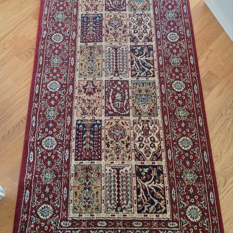 IKEA käytävämatto punainen, perinteinen kuviollinen malli. Pitkulainen matto sopii käytävään, eteiseen tai muihin kapeisiin tiloihin.