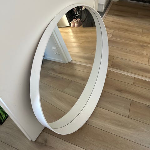 Myydään hyväkuntoinen IKEA Langesund on pyöreä seinäpeili, jossa on valkoinen kehys. Peilin taustapuolella on kiinnityskohdat seinäasennusta varten. Sopii esimerkiksi eteiseen, makuuhuoneeseen tai kylpyhuoneeseen yleispeiliksi.