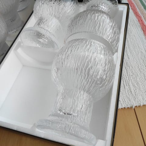 Iittala lasimaljat kirkasta lasia. Paksupohjaiset, jalalliset kulhon muotoiset lasit, joissa on kohokuvioitu, jäämäinen pinta. Sopivat esimerkiksi jälkiruoka- tai tarjoilulaseiksi. Myydään kahden lasin settinä kuvien mukaisesti. Tarroja ei ole. Vanhat, mutta hyvässä kunnossa. Voit myös tarjota hintaa!