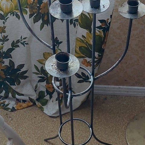 Myydään kuvissa oleva 5 kynttilän lattiakynttelikkö. Mustaksi maalattua rautaa.