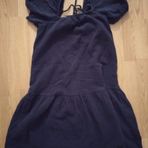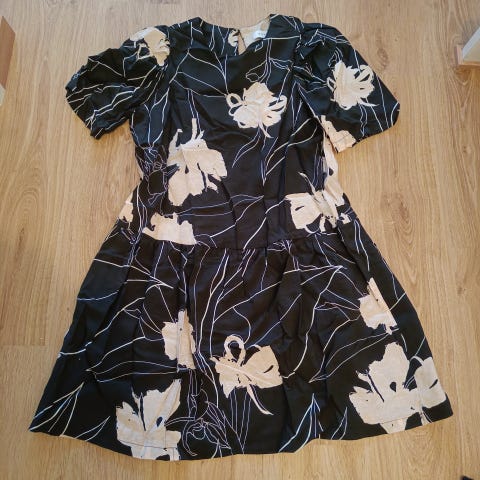 Vero Moda kesämekko, koko S. Mekko on musta ja hihaton. Yläosa on neulottua, kuvioitua materiaalia ja alaosa kevyempää, laskeutuvaa kangasta. Valmistettu kierrätetystä polyesteristä.