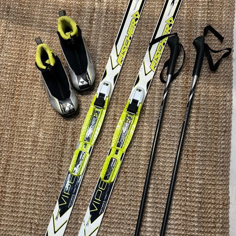 Fischer RC Junior XC -maastohiihtosukset lapsille. Pituus 110. Sukset ovat kelta-mustat ja niissä on NNN-siteet. Pohjissa perinteisen maastohiihtosuksen kuviointi.