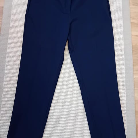 Andiata naisten housut, koko 42. Materiaali 97 % puuvillaa ja 3 % elastaania. Kuviollinen kangas, jossa valkoinen pohja ja sinisävyinen kuviointi. Vetoketju sivussa, edessä pienet taskut, lahkeissa käänteet. Vajaamittaiset, arviolta 7/8. Käyttämättömät.