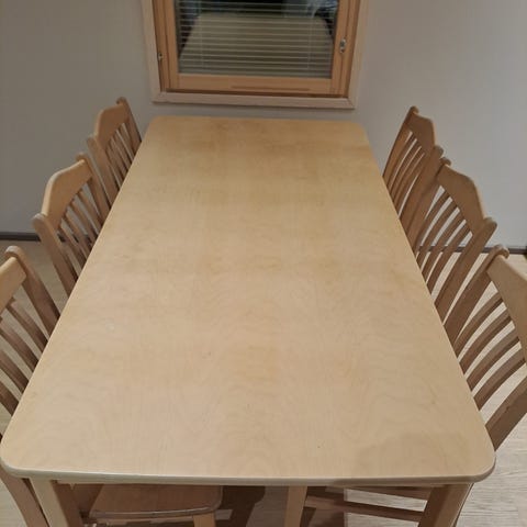 Suoraan käytöstä, perus siistit, muttei kuitenkaan enää uudet. Mitat, pöytä jatkettava 175cm/jatkon kanssa 215cm, leveys 95 ja korkeus 74cm. Kuusi tuolia 45x50 istuin korkeus 45, selkänojan päältä 100cm. Eläintalous