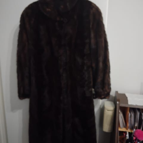 Pitkä sinihopeinen minkinpalaturkki. Turkki on vanha, mutta ei ole ollut käytössä pitkään aikaan. Turkis kaunis ja ehjä, mutta vuori rikki.