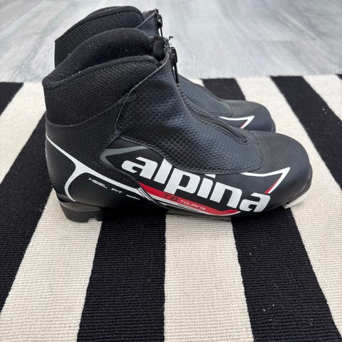 Alpina hiihtomonot. Väri musta punaisin yksityiskohdin. Nauhakiinnitys ja päällä vetoketjullinen suojaläppä. Pehmustettu varsi ja kanta, takaosassa vetolenkki helpottamassa pukemista. Pohjassa uritettu rakenne ja kiinnike maastohiihtosidettä varten.