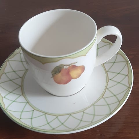 Täysin ehjä setti, tarjoilulautanen, kermakko ja sokerikko.