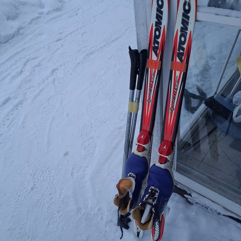 Annetaan lasten suksipaketti hiihtoa aloittelevalle. Sukset 140cm, sauvat 100cm, monot 35. Suksissa keskellä pitopohja harpulla. Toisesta suksesta pohja irti takapäästä 2cm matkalta.