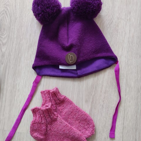 Merinovillapaita ja -housut, laventelinväriset. Vaatteissa pieniä reikiä, mutta ovat pitäneet lapsen edelleen lämpimänä.