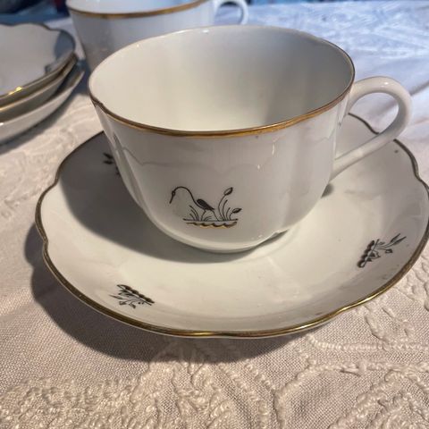 Arabian vanhat kahvikupit ja aluslautaset. Valkoinen posliini, jossa kultareunus ja tummasävyinen koristekuvio kupin kyljessä ja lautasessa. Sopii kahvin tai teen tarjoiluun. Myydään kuvissa näkyvänä settinä 4 kupilla ja aluslautasella. Kaupan päälle 2 ylimääräistä aluslautasta. Kultaukset hyvässä kunnossa.