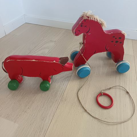Ehjä mutta ajan ja leikkien patinoima puinen, talutushihnassa vedettävä koiranpentu n. 1930-luvun alkuvuosilta. Ensimmäisen ja ainoan omistajan jäljiltä, maalipinta kulunut pääosin pois, hihna kadonnut, muuten ok: pyörät pyörivät ja rullaavat kevyesti. Korvat ja häntä nahkaa. Lienee alunperin tarkoitettu sisäleikkeihin. Pituus 135 mm, leveys 120 mm, korkeus 125 mm. Hauveli Tampereella, lähetyskulut lisätään, kysy!