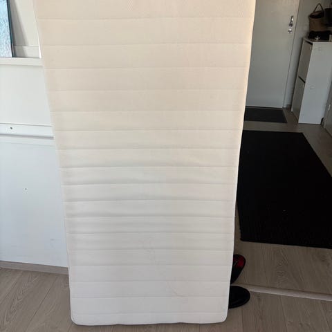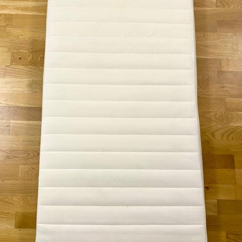 Lasten sänkyyn tai pinnasänkyyn sopiva patja koossa 70 x 140 cm. Toisella puolella tahraa, muuten siisti.