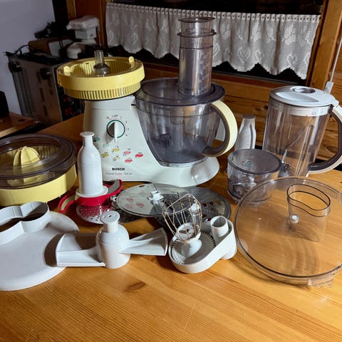Bosch monitoimikone useilla lisäosilla. Pakettiin kuuluu perusrunko kulholla, taikinakoukku, vispilä, sekoitinkannu sekä erilaisia teriä ja levyjä raastamiseen ja viipalointiin.