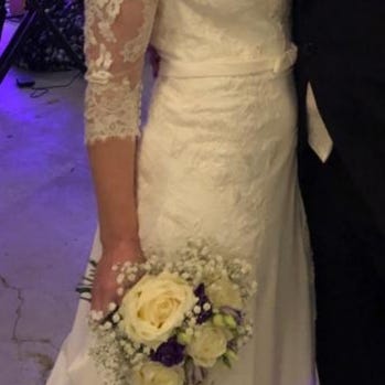 Ihana Mecco-merkkinen hääpuku. Kauniit yksityiskohdat. Teetetty mittojen mukaan xs/s-kokoiselle. Takana nyöritykset, joiden ansiosta istuu kauniisti juuri sinun päällesi. Pidetty päällä vain vihkimisen ajan.