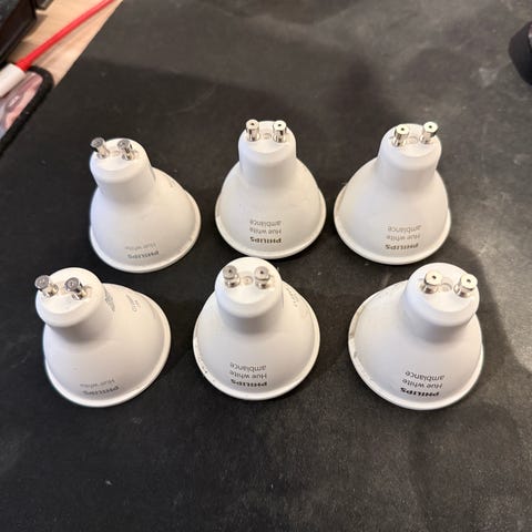 Philips Hue Bridge ja neljä Philips Hue Dimmer Switch-kaukosäädintä.