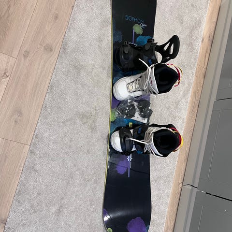 Burton Clash aloittelijaystävällinen lumilauta burtonin siteillä. Lumilaudan pituus 155. Laudan molemmissa päissä käytön jälkiä, näkyvät viimeisessä kuvassa paremmin.