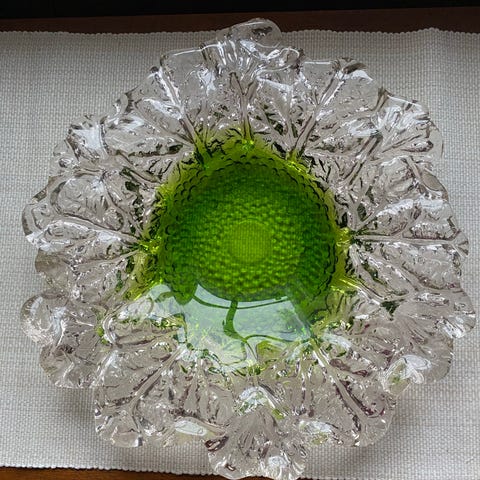 Iittala lasimalja kirkasta lasia. Epäsymmetrinen, veistoksellinen reuna ja paksu lasirakenne. Sopii esimerkiksi tarjoilu- tai koristekulhoksi pöydälle tai hyllylle. Valmistettu Suomessa, pohjassa näkyy muottijälkiä ja lasin luonnollista tekstuuria.