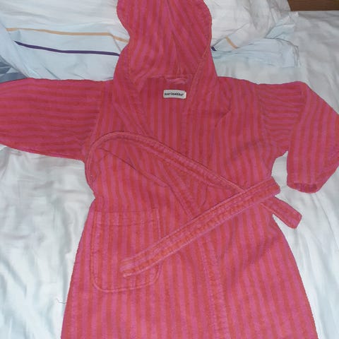 Marimekko Varvunraita kylpytakki koossa M, pitkä malli. Materiaali on musta-valkoraidallinen puuvilla, oikein hyvä kunto, vaikka on vähän käytetty. Hihoja on hieman jatkettu. Mallissa on vyö ja ripustuslenkki.