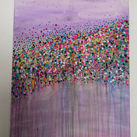 Myyntiin näyttävä, käsinmaalattu abstrakti teos. Vahva värimaailma ja kultaiset yksityiskohdat tekevät taulusta katseenvangitsijan.