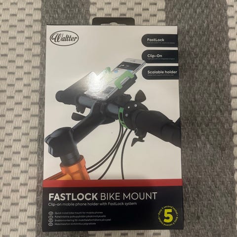 Puhelinteline pyörän ohjaustankoon. Kovakantinen kotelo, jossa läpinäkyvä etuosa kosketusnäytölle ja vetoketjusulku. Sisällä pehmustettu tasku ja verkkotasku pienille tarvikkeille. Takapuolella kiinnityspiste ohjaustankokiinnikkeelle. Soveltuu älypuhelimen kuljettamiseen ja käyttöön pyöräillessä. Käyttämätön.