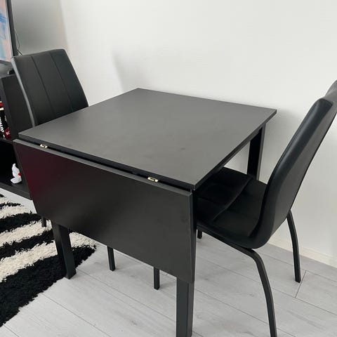 Pöytä jatkettava, jatkopalan kanssa pituus 174 cm. Ilman jatkopalaa 129 cm. Pöytälevyssä pienet syvemmät naarmut, näkyvät kuvassa. Käytönjälkiä on, mutta ehjät ja jämerät.