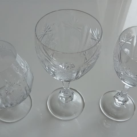 Tarpeettomana myydään juhlava setti laseja. Hiukan käytön jälkiä joidenkin lasien reunoilla.