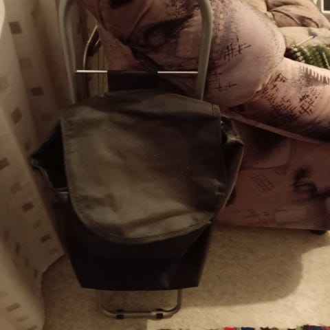 Vähän käytetty vedettävä ostoskärry vettähylkivää polyesteriä. Tilavuus 33 litraa. Kokoontaitettavat ja irrotettavat pyörät
