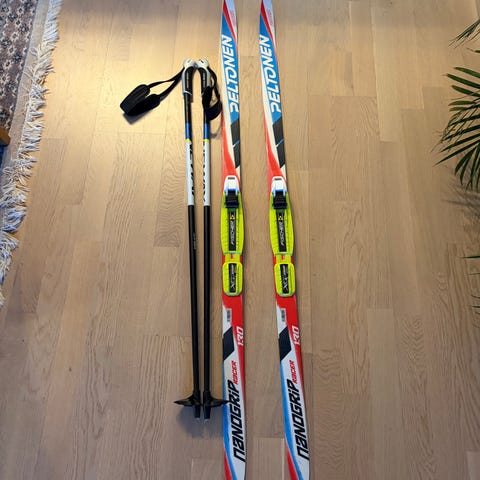Myydään settinä Peltosen nanogrip Angry Birds sukset NNN-siteillä ja Fischerin sauvat. Suksien pituus 110cm, sauvojen 85cm.