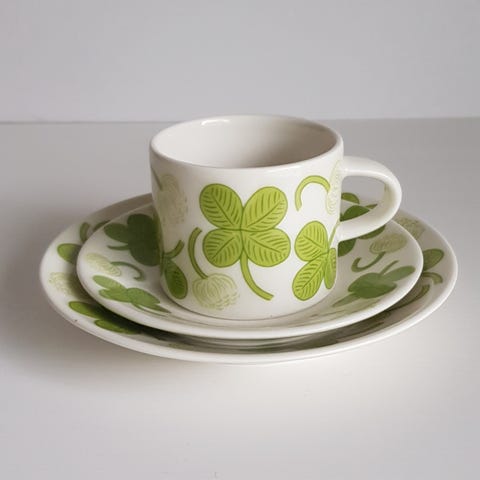 Erittäin hyväkuntoiset ja vähän käytetyt Apila-kahvikupit ja lautaset.