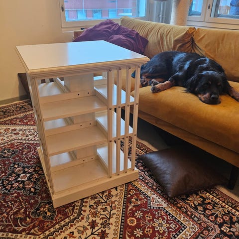 Hyväkuntoinen Boknäsin kirja/dvd/cd-karusellihylly. Kolme hyllytasoa, joista alin on korkein.