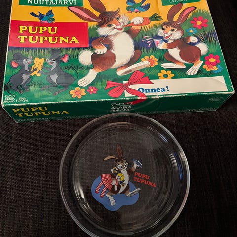 Vintaget retro retrot 1980 80-luku 80-luvun 1980-luvun 1980-luku syvä lautanen keinuhevonen muro murokulho puput jänis jänikset lasten lapsen kulhot astia kuppi kupit tupunat lautanen syvä syvälautautanen
