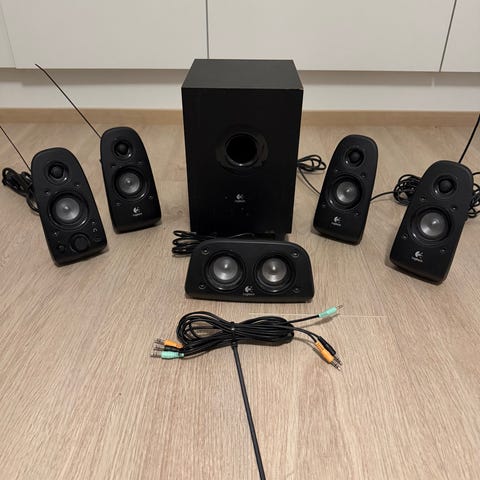 Logitech 5.1-kaiutinjärjestelmä, jossa on subwoofer ja useita satelliittikaiuttimia. Ohjain puuttuu, mutta ei vaikuta käyttöön!