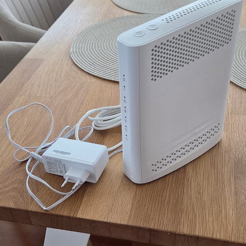 DNA Mesh WiFi F-3896 kaapelimodeemi. Laitteessa on sisäänrakennettu langaton verkko (WiFi) ja se on tarkoitettu käytettäväksi kaapelilaajakaistan kanssa. Mukana tulee virtalähde, koaksiaalikaapeli ja tarvittavat liittimet kaapeliverkkoon kytkemistä varten. Modeemin kyljessä on merkittynä SSID- ja MAC-tiedot sekä muut tekniset tunnisteet. Soveltuu kodin tai pienen toimiston internet-yhteyden jakamiseen useille laitteille langattomasti ja verkkokaapelin kautta.