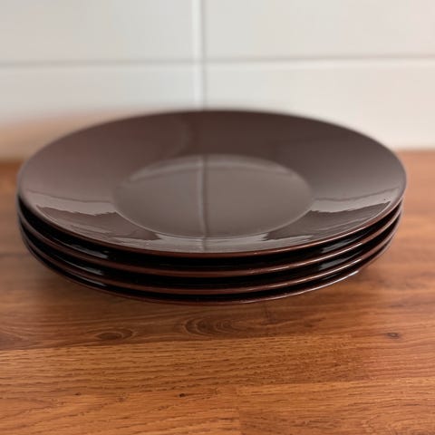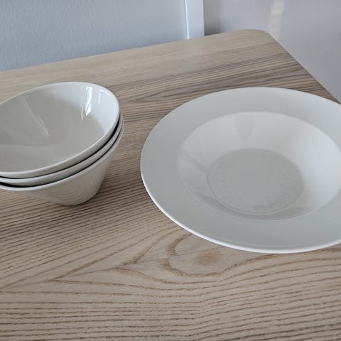 6 isoa lautasta, 9 mukia ja kaksi kulhoa. Pieniä käytön jälkiä näkyvissä
