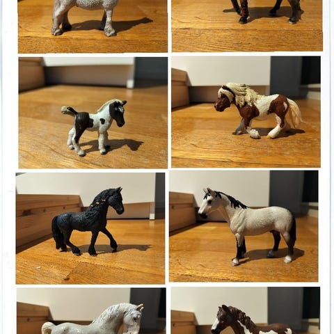 Myydään kuvassa näkyvä heppatalli (ei schleich merkkinen) ja Schleich hevoset, varsat, ratsastajat + muut tarvikkeet. Leikeissä olleet. Osa hepoista uudenveroisia, osassa enemmän jälkeä. Tallissa myös käytönjälkiä.