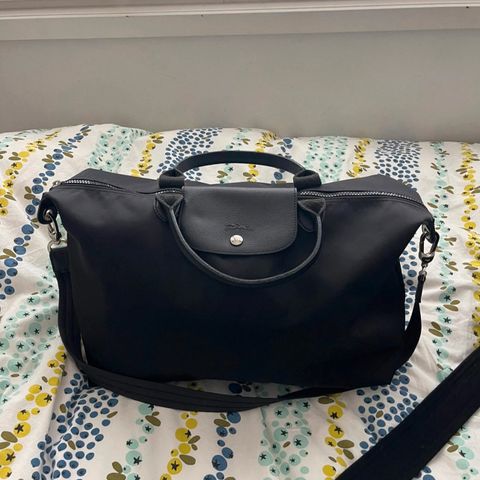 Mukana Longchamp-merkitty nahkainen nimilappu ja ruskeita nahkaisia yksityiskohtia. Soveltuu käsimatkatavaraksi, joustaa alle 25 cm paksuiseksi. Laajennettava vetoketjulla.