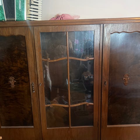 Antiikkinen puinen vaatekaappi lasiovilla ja koristekaiverruksilla