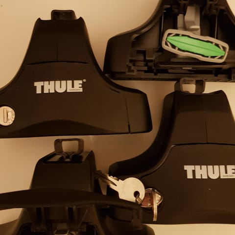 Thule kattotelineen jalkasarja. Kuvissa neljä jalkaa sekä lukitusosat/tangot. Sopii Thulen kattotelinejärjestelmään, tarkempi yhteensopivuus kannattaa varmistaa omasta autosta ja Thulen taulukoista. Muovinen ja metallinen rakenne, tarkoitettu auton kattokaiteisiin tai -kouruihin mallista riippuen.