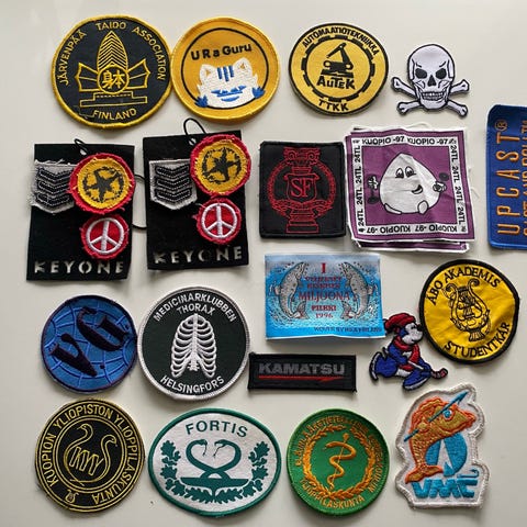 Myyn kuvan neljä vanhaa TTL ry haalarimerkkiä (yhdistys on nykyisin Tivia ry). Vastaavia tuskin tulee ihan heti vastaan.