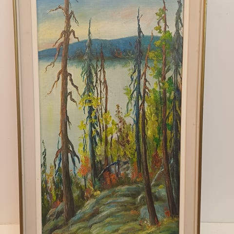 Otto Vartiovaaran öljyvärityö levylle, "Akkunusjoen latvoilta ruska-aikana", vuodelta 1940. Koko kehyksineen 35 x 40 cm.