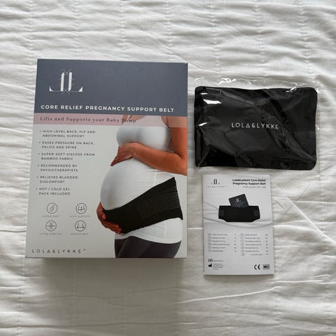 Lola&Lykke tukivyö raskaana oleville. Musta, koko M. Tarrat kiinnittyy hyvin, muutenkin siisti. Pakettiin kuuluu käyttöohjeet ja käyttämätön lämpö/kylmägeelipussi.
