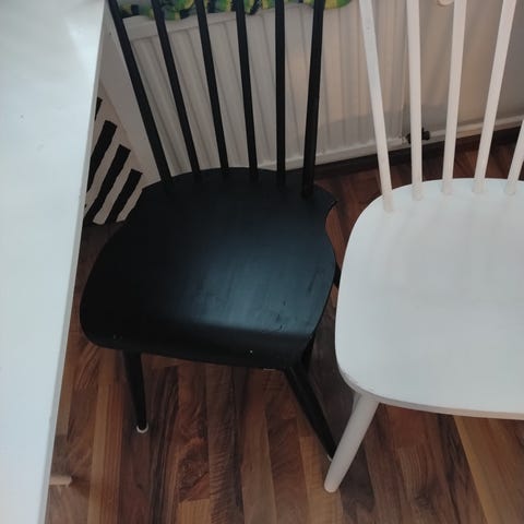 Tuolien pinnoissa ja jaloissa pientä värieroa, ei niin voimakasta kuin kuvissa.