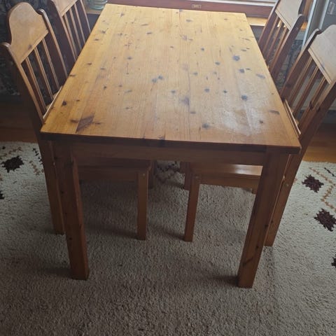 Massiivipuinen pöytä on painava ja tukeva, myös tuolit on tukevat, ei hetku eikä nitku. Mustanruskeissa tuoleissa nahka/keinonahkaverhoilu.