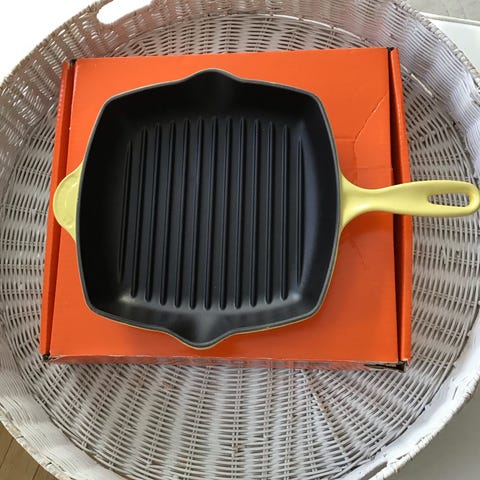 Le Creuset valurautainen grillipannu, neliönmuotoinen malli. Pannussa on sisäpuolella musta emaloitu grillipinta ja ulkopuolella punainen emalipinnoite. Soveltuu lihan, kalan, kasvisten ja muiden ruokien grillaamiseen liedellä tai uunissa valmistettaessa. Pannussa on kaatonokat reunoilla nesteiden ja rasvan valuttamista varten sekä pitkä kahva helpottamaan käsittelyä.
