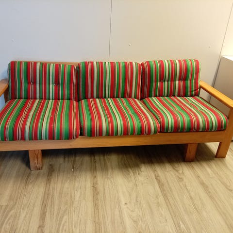 Levitettävä puusohva, patjat mukaan. Patjat hieman liian leveät, kun sohvan levittää, patjat voi kaventaa omatoimisesti halutessaan. Elämisen jälkiä puussa, mutta muutoin kelpo yksilö. Vain nouto ja omat kantajat mukaan. Sijainti Nivavaara ja koiratalous, koirat eivät ole viettäneet aikaa tällä sohvalla.
