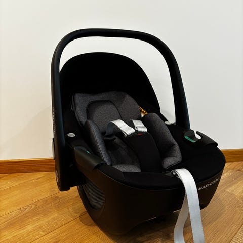 Maxi-Cosi Pebble 360 turvakaukalo ja telakka. Kuvassa näkyy pieni reikä aurikosuojassa. Valmistusajankohta 06/21