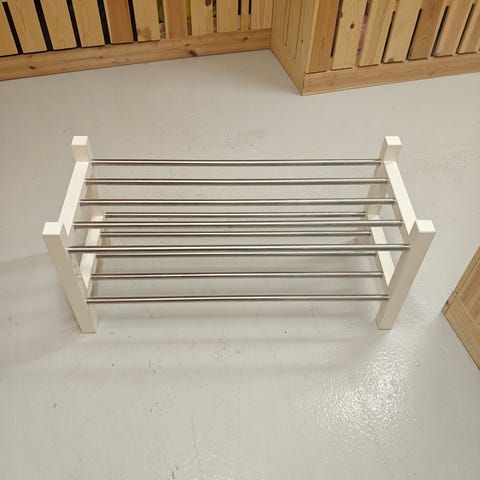Musta metallinen kaunis kenkäteline. Ei keiku, on tukeva.